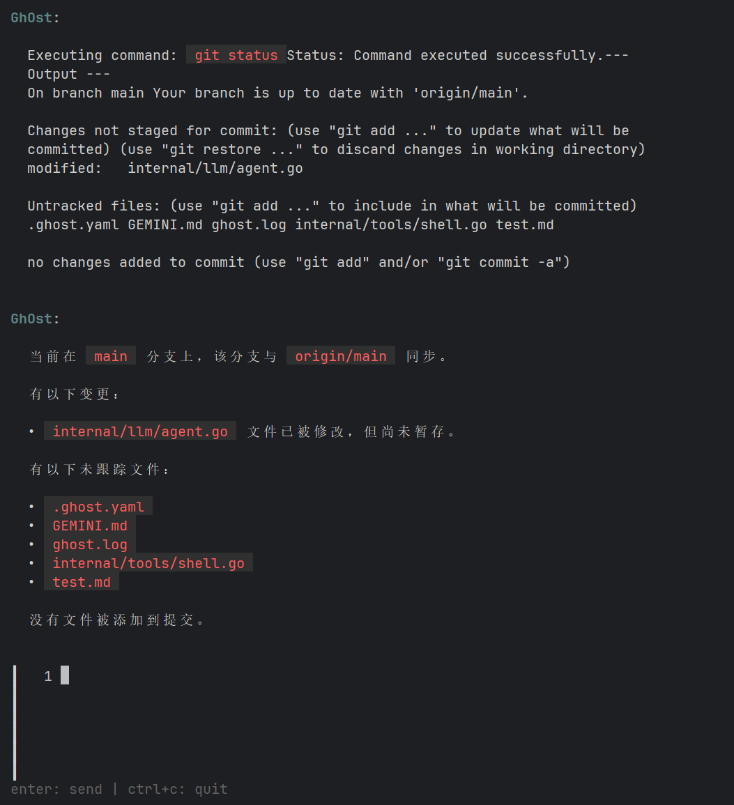 switch msg.Type { case tea.KeyCtrlC, tea.KeyEsc: return m, tea.Quit case tea.KeyEnter: prompt := strings.TrimSpace(m.textarea.Value()) if prompt != "" && !m.loading && !viewState.IsConfirming { cmd = m.agent.HandleUserInput(prompt) m.textarea.Reset() m.viewport.SetContent(m.renderConversation(true)) m.viewport.GotoBottom() return m, cmd } } }