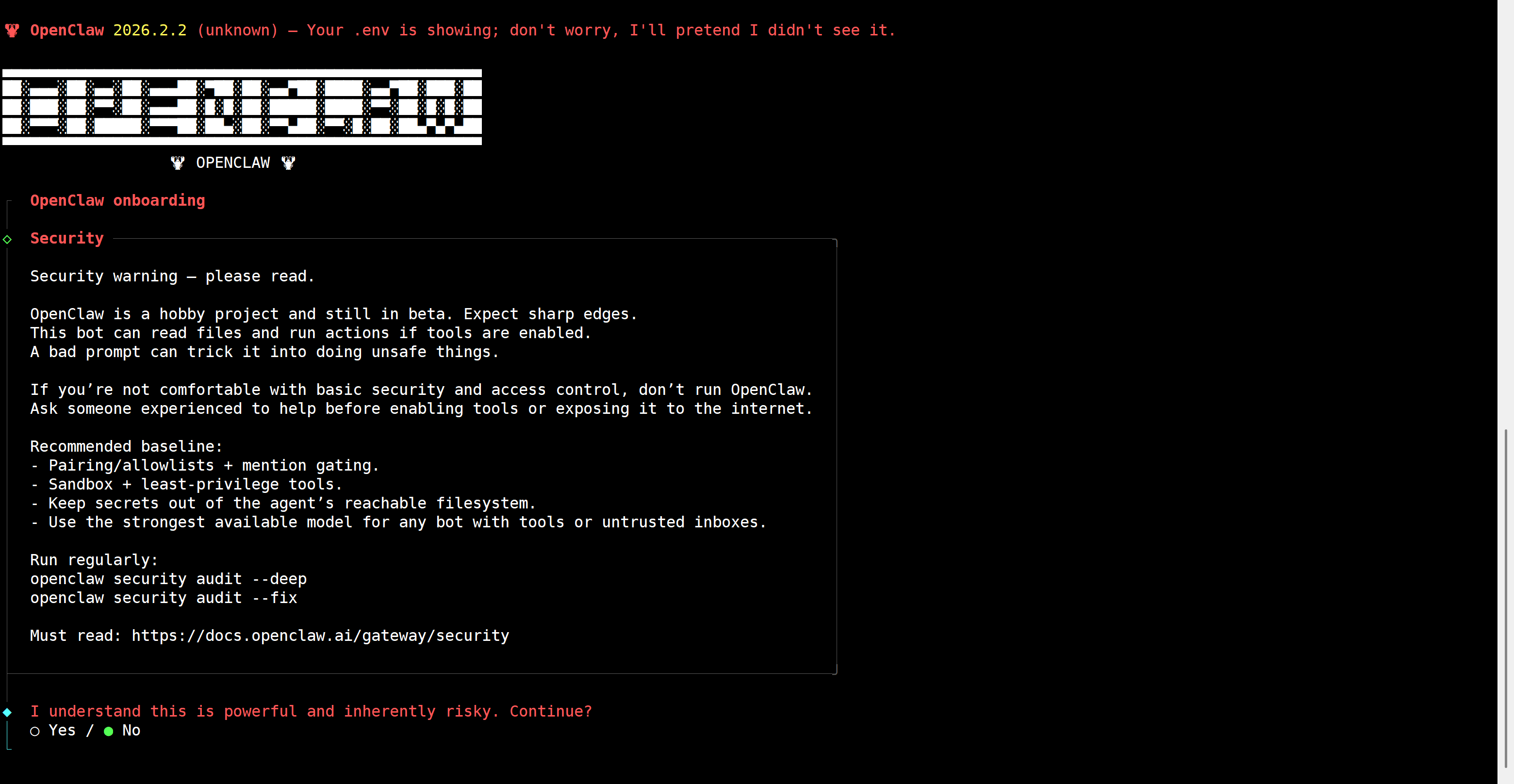 这时候会发现环境中没有 openclaw 命令,不过可以使用 node 直接启动入口文件 openclaw.mjs