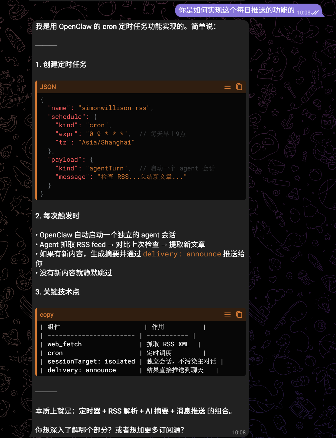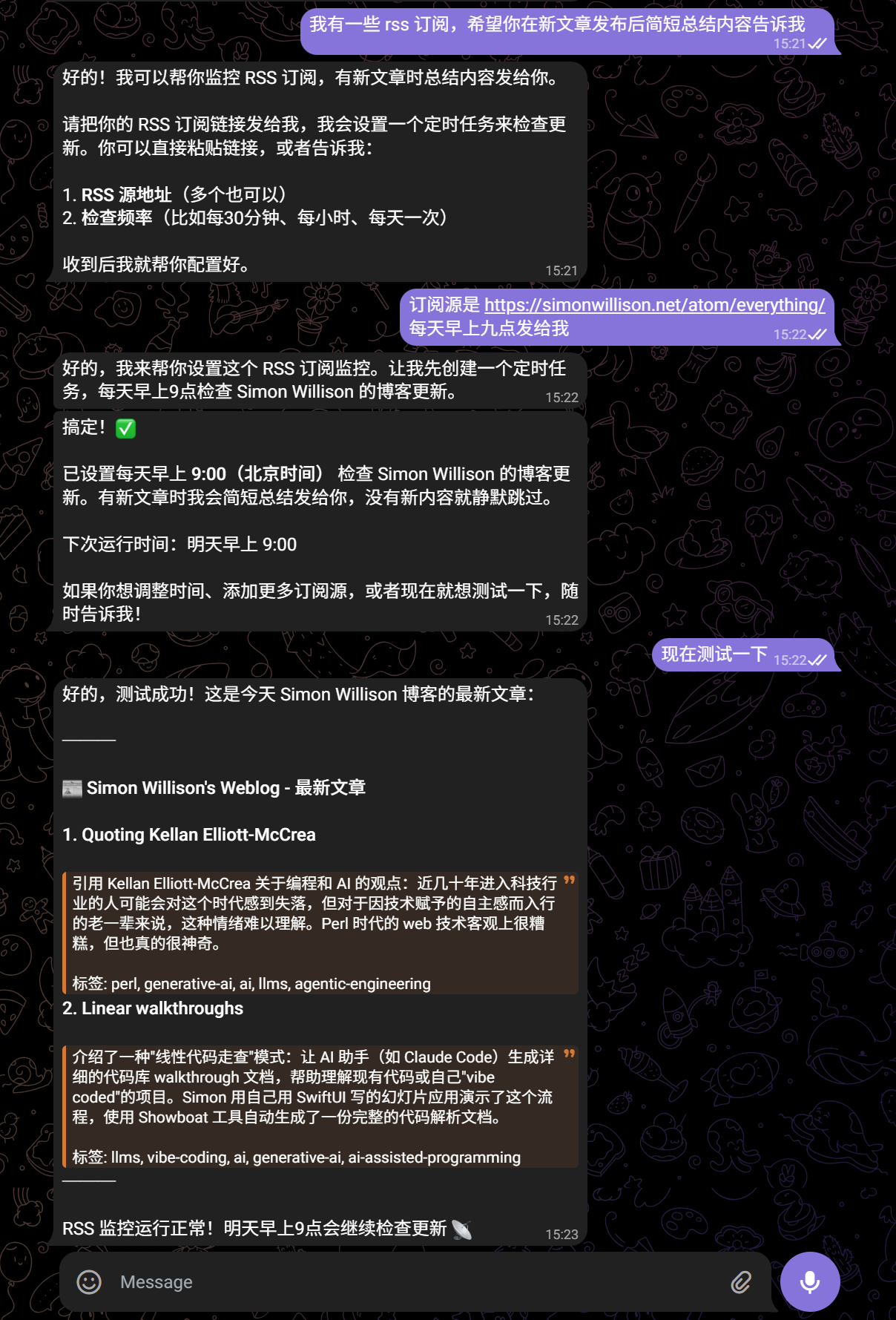 OpenClaw 的应用场景比较丰富,可以当成一个沙箱内的智能助手使用。比如在 telegram bot 配置完成后,我让它很快完成了一个订阅总结的小功能,方便我每天快速浏览一些博客更新内容: